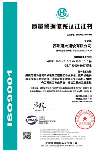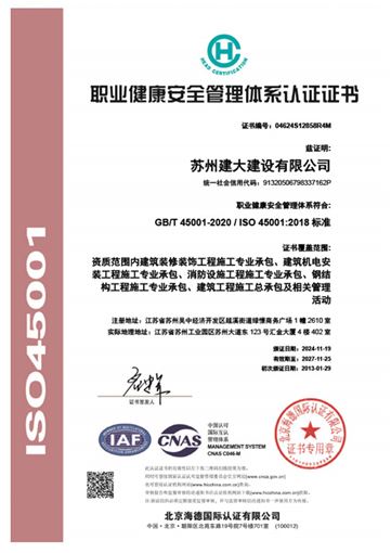 目前我司擁有建筑工程施工總承包 2 級(jí)、石油化工管道總承包 2 級(jí)、機(jī)電安裝工程專業(yè)承包 1 級(jí)、消防設(shè)施工程專業(yè)承包 1 級(jí)、建筑裝修裝飾工程專業(yè)承包 2 級(jí)、鋼結(jié)構(gòu)工程專業(yè)承包 2 級(jí)等相關(guān)資質(zhì),并通過(guò)了GB/T 19001-2016/ISO 9001:2015和GB/T 50430-2017標(biāo)準(zhǔn)質(zhì)量管理體系、GB/T 24001-2016/ISO14001:2015環(huán)境管理體系、GB/T 45001-2020/ISO 45001:2018標(biāo)準(zhǔn)職業(yè)健康安全管理體系的認(rèn)證。
