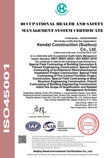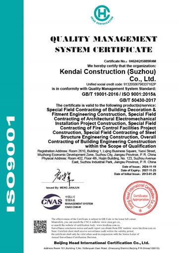 We hold several relevant qualifications, including Grade 2 General Contractor for Construction Projects, Grade 2 General Contractor for Petrochemical Pipeline Projects, Grande 1 Specialist Contractor for Mechanical and Electrical Installation, Grande 1 Specialist Contractor for Fire Protection Facilities Engineering, Grand 2 Specialist Contractor for Construction Decoration, and Grande 2 Specialist Contractor for Steel Structure, with certification of standard quality management system GB/T 19001-2016, ISO 9001:2015, GB/T 50430-2017, certification of environment management system GB/T 24001-2016, ISO14001:2015, and certification of standard occupational health and safety management system GB/T45001-202, ISO45001:2018.